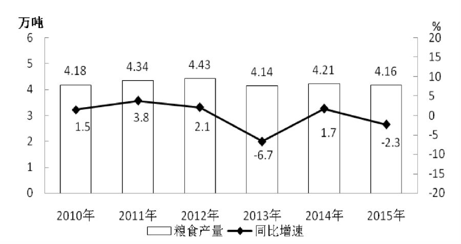 例題:某市2015年全年糧食總產(chǎn)量4.16萬噸,同比下降2.3%;甘蔗產(chǎn)量0.57萬噸,下降23.6%;油料產(chǎn)量0.12萬噸,增長32.4%;蔬菜產(chǎn)量15.79萬噸,下降3.4%;水果產(chǎn)量7.84萬噸,增長7.4%。