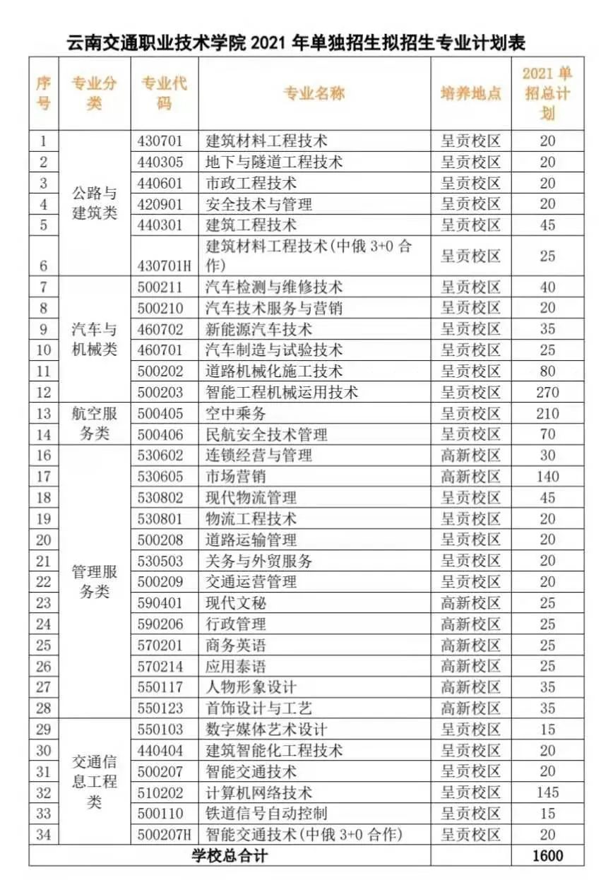 云南交通職業技術學院2021年單獨招生計劃為1600人,計劃招生專業及招生計劃數詳見下表。最終以云南招考頻道公布為準。