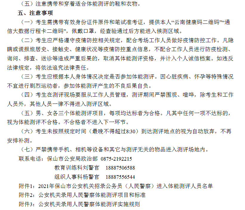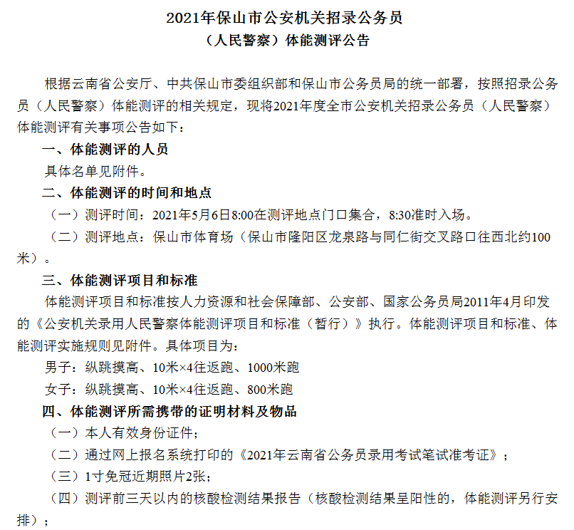 附件1:2021年保山市公安機關招錄公務員(人民警察)進入體能測評人員名單.xlsx 保山市公安局 2021年5月1日 來源:http://zswldj.1237125.cn/html/bs/2021/5/1/4c7a7896-a4f7-46c8-86c5-c346cce65983.html