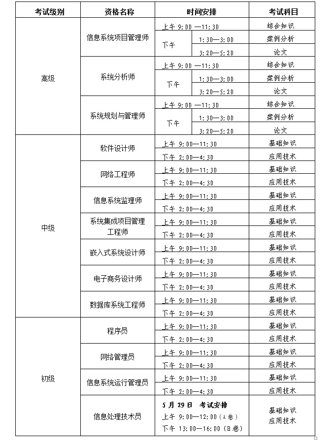 2022年上半年全國計算機技術與軟件專業技術資格(水平)考試時間安排(附表一)