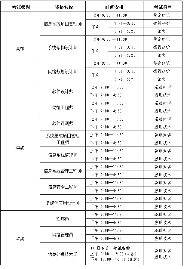 2022年下半年全國計算機技術與軟件專業技術資格(水平)考試時間安排(附表二)