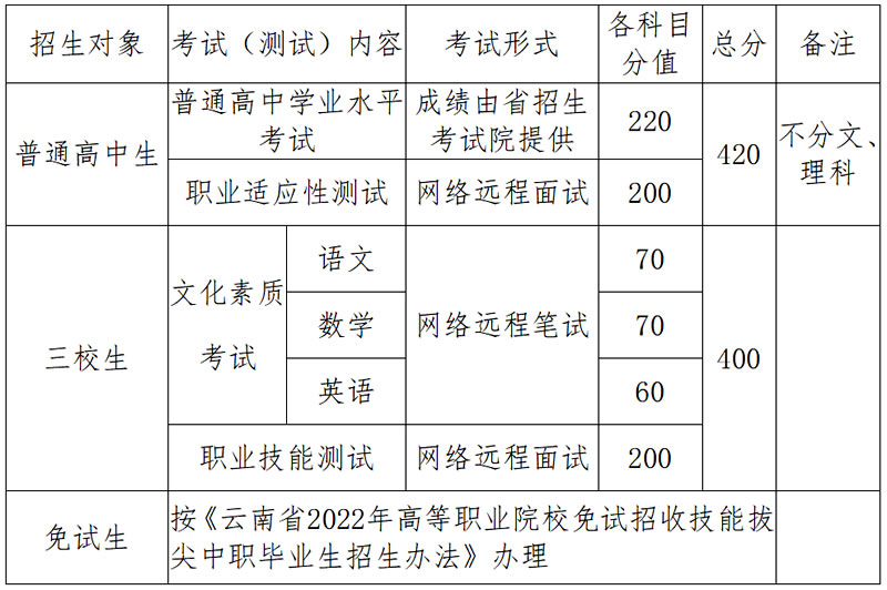 根據《云南省2022年高職院校單獨考試招生辦法》《云南省2022年高等職業院校免試招收技能拔尖中職畢業生招生辦法》的文件精神,為了組織好我校2022年單獨考試招生工作,特制定本方案。