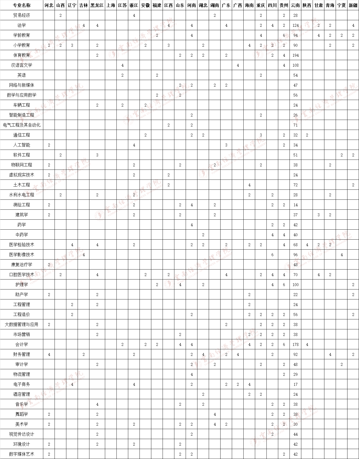 云南經濟管理學院2022年本科招生計劃表