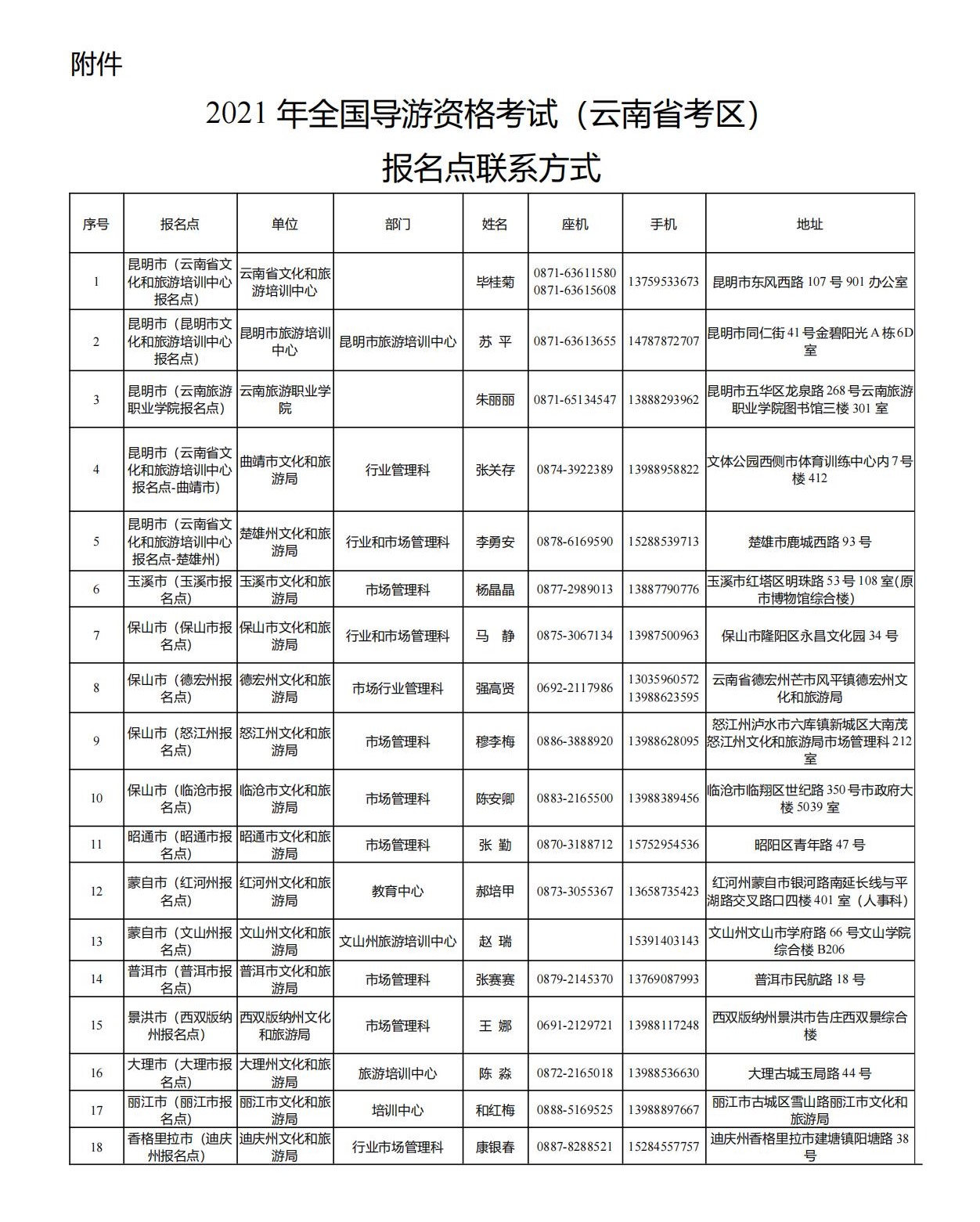 附件:2021年全國導游資格考試(云南考區)報名點聯系方式