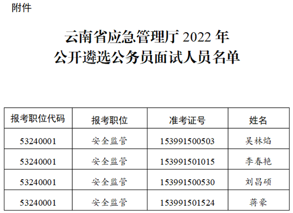 附件:云南省應急管理廳2022年度公開遴選公務員進入面試人員名單