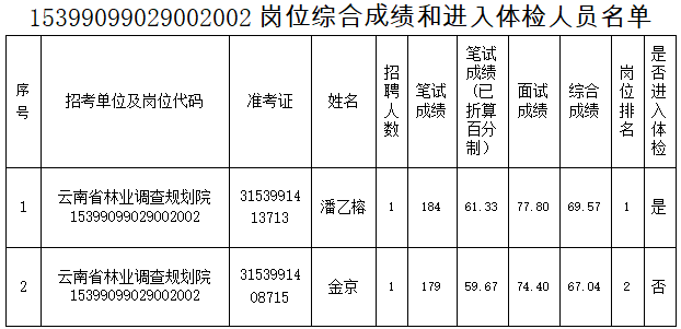 根據《云南省林業和草原局2022年事業單位公開招聘工作人員公告》安排,筆試、面試工作已經結束。現將15399099029002002崗位考生綜合成績及后續工作安排公告如下: