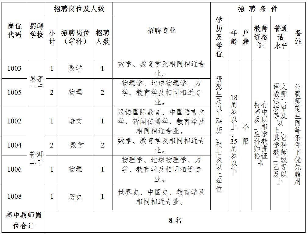 | 1 | 1003 | 普洱市思茅區(qū)教育體育局 | 思茅一中 | 全額撥款 | 數(shù)學(xué) | 數(shù)學(xué)、教育學(xué)及相同相近專業(yè)。 | 研究生及以上學(xué)歷、碩士及以上學(xué)位 | 1.持有高中及以上相應(yīng)學(xué)科教師資格證書(shū); 2.語(yǔ)文教師普通話等級(jí)水平達(dá)二級(jí)甲等及以上,其他教師普通話等級(jí)水平達(dá)二級(jí)乙等及以上。 | 1 |