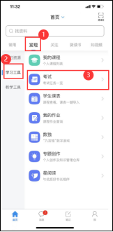 方式二:學(xué)校發(fā)起了考試后,點(diǎn)擊首頁(yè)——發(fā)現(xiàn)——學(xué)習(xí)工具——考試,點(diǎn)擊進(jìn)入考試即可。