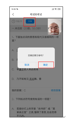 2.本次考試全程進(jìn)行錄像監(jiān)控,進(jìn)行前后攝像頭抓拍和屏幕抓拍,請(qǐng)調(diào)整好答題姿勢(shì),確保面部頭像完整顯示,屏幕抓拍只應(yīng)用于考試監(jiān)考,不會(huì)獲取其他信息。由于本次考試需要進(jìn)行人臉識(shí)別監(jiān)控和屏幕抓拍,系統(tǒng)需要獲取您的攝像頭權(quán)限,請(qǐng)確認(rèn)同意。進(jìn)行人臉識(shí)別時(shí),請(qǐng)摘下口罩。