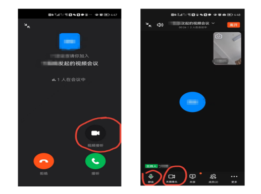 三、考試開始前,監(jiān)考老師會(huì)在群里發(fā)起視頻會(huì)議,請(qǐng)各位同學(xué)點(diǎn)擊“視頻接聽”,如下左圖所示,并打開麥克風(fēng)和視頻,不能擅自將麥克風(fēng)設(shè)置為靜音和關(guān)閉視頻,保持如下右圖的狀態(tài)。