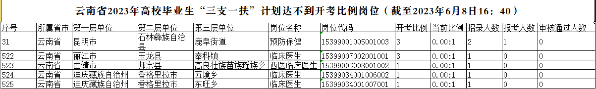 2023年云南省三支一扶計劃達不到開考比例崗位(截至6月8日16:40)