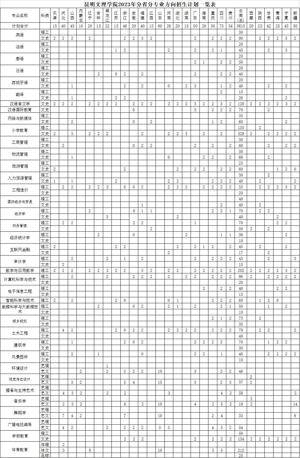 昆明文理學(xué)院2023年普通類分省分專業(yè)方向招生計(jì)劃一覽表