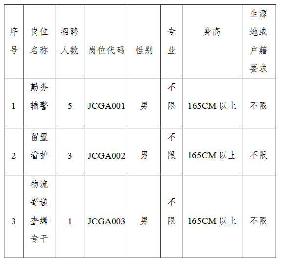 因工作需要,江城哈尼族彝族自治縣公安局現面向社會公開招聘警務輔助人員9名(其中勤務輔警5名、留置對象看護人員3名、物流寄遞查緝專干1名),有關事項公告如下: