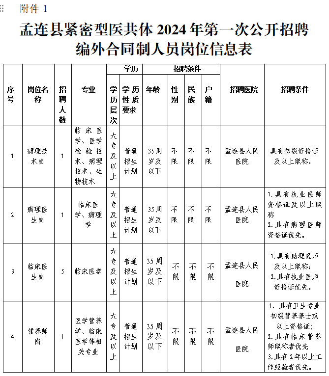 詳見《孟連縣緊密型醫共體2024年第一次公開招聘編外合同制人員崗位信息表》。