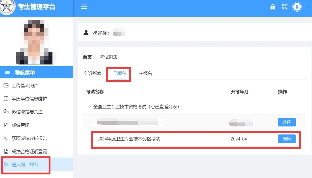 登錄考生管理平臺后,點擊左側導航欄“進入網上報名”,在“已報名”考試列表中選擇考試項目。