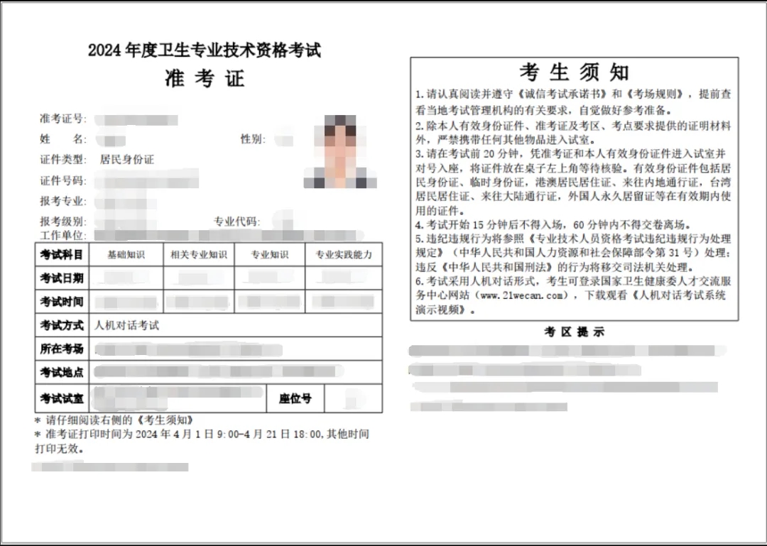 (衛生專業技術資格考試準考證圖例)