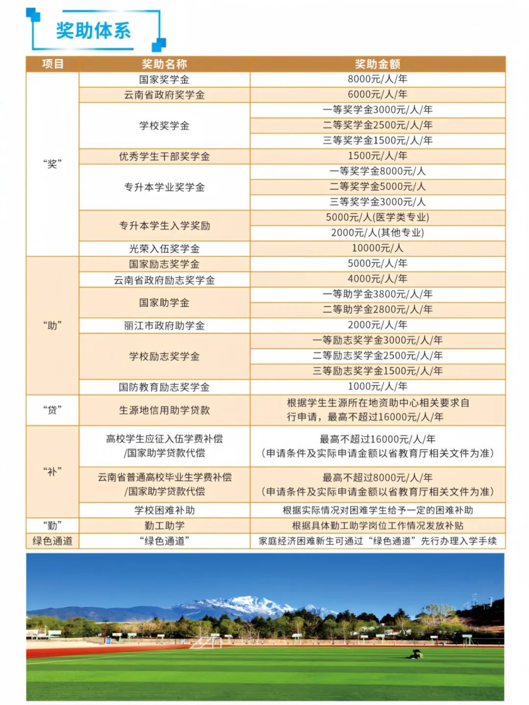 麗江文化旅游學院(原云南大學旅游文化學院)自2020年起,單獨設(shè)立專升本學生專項資助獎勵體系,對學業(yè)優(yōu)秀的學生和貧困學生進行獎勵和資助。
