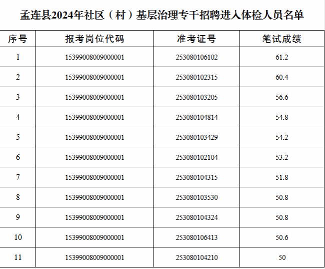 (三)參加體檢人員:報考孟連縣2024年社區(村)基層治理專干、符合《云南省2024年社區(村)基層治理專干招聘公告》規定的通過資格復審的人員。(詳見附件)