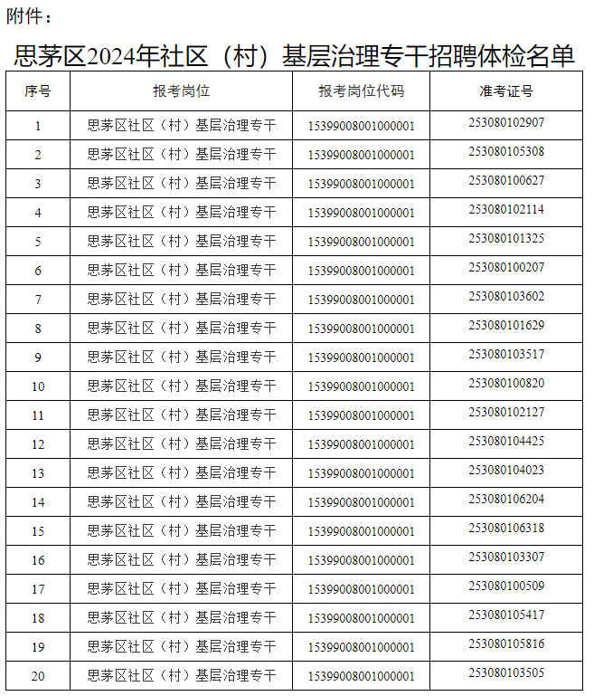思茅區2024年社區(村)基層治理專干招聘體檢名單(詳見附件)。