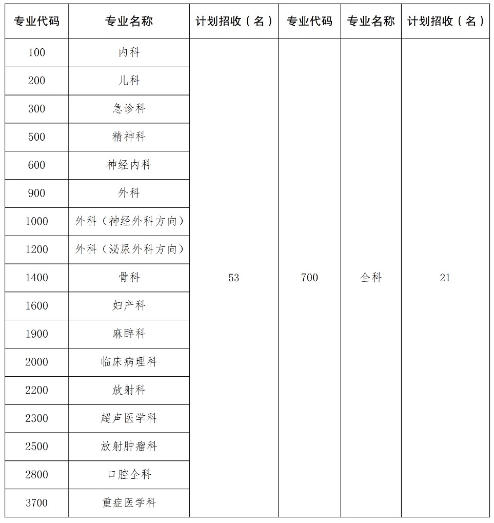 2024年我院計劃招收74名住培醫師,其中全科專業計劃招收21名,其他專業計劃招收53名,具體招收如下: