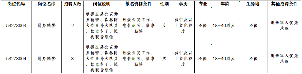 本次招錄共設2個崗位,女性2人,男性3人。詳情請關注“西盟警方”微信公眾號查詢。