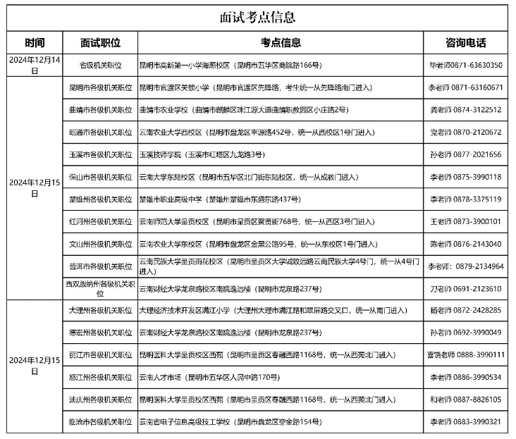 面試分兩天組織實施,2024年12月14日開展省級職位面試;2024年12月15日開展州(市)級及以下職位面試,具體考點信息安排詳見附件。同時進入省級職位和州(市)級及以下職位面試的考生,須分別參加12月14日和12月15日兩次面試,請各位考生合理安排行程。