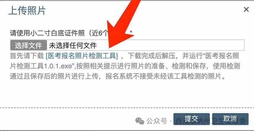 (四)報名照片:考生網上報名前,先按要求準備近期6個月內正面免冠小2寸白底證件數碼彩色證件照(照片必須清晰,亮度足夠,頭像占照片的2/3,露眉露耳,jpg/jpeg格式)。需按照系統提示內容下載并運行“醫考報名照片檢測工具”(如圖),網報系統只接受經該工具檢測通過且保存后的照片進行上傳,照片不符合要求的,不予進行資格審核。請廣大考生提前準備,以免影響考試報名。