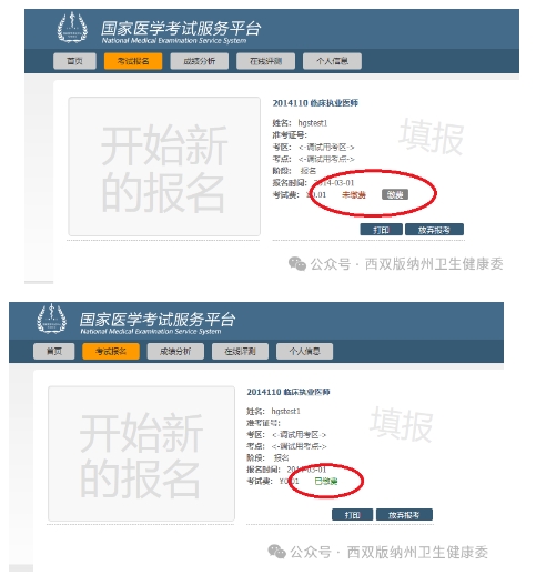 請考生及時關注“國家醫學考試中心官網考生服務端”,考區復審通過后即出現“繳費”灰色字樣,請點擊并按時完成繳費,出現“已繳費”綠色字樣即為成功(如圖)。已繳費但未顯示正確狀態,可在繳費位置進行點擊刷新,如意外狀況無法解決請及時聯系工作人員。