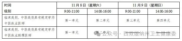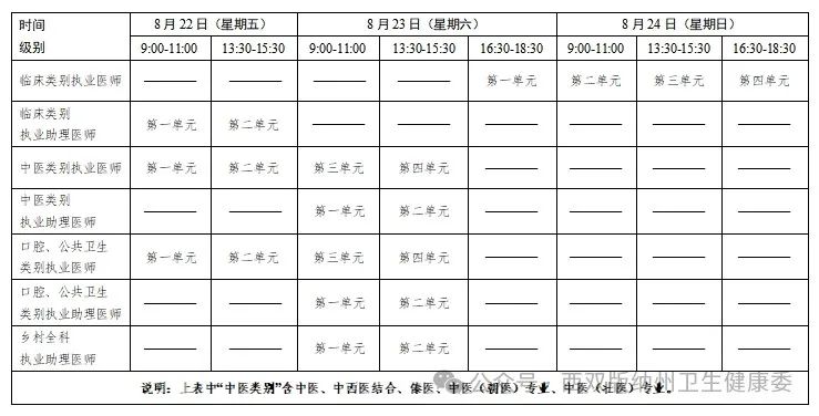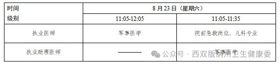 考試實行計算機化考試(含傣醫類別),軍隊現役人員加試軍事醫學專業考試,申請參加短線醫學加試科目的考生參加院前急救崗位和兒科專業加試相應內容。統一考試時間如下: