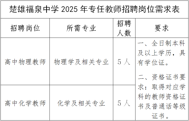 楚雄福泉中學關于2025年公開招聘部分學科專任教師的公告(一)