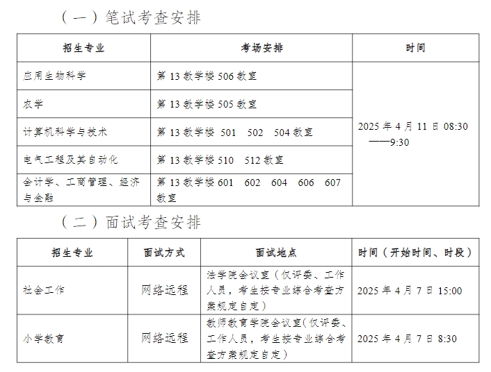 (二)筆試+面試。經(jīng)濟管理類(會計學(xué)、工商管理、經(jīng)濟與金融等專業(yè))、農(nóng)學(xué)類專業(yè)(農(nóng)學(xué)、應(yīng)用生物科學(xué)專業(yè))、計算機科學(xué)與技術(shù)、電氣工程及其自動化等專業(yè)采用“筆試+面試考查方式。