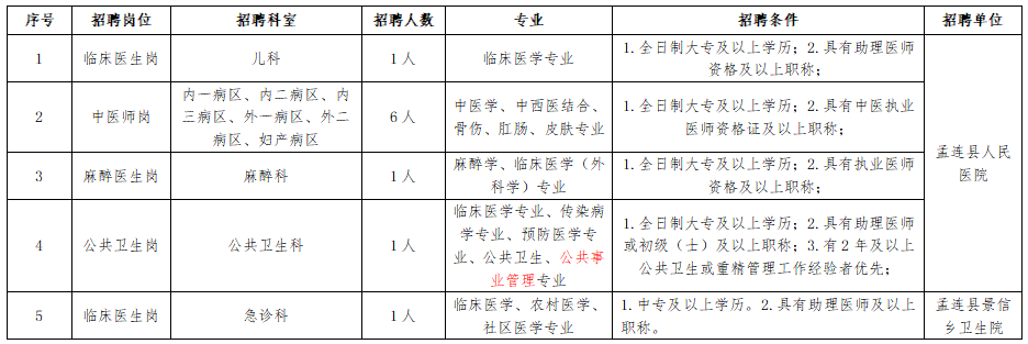 為進一步加強孟連縣緊密型醫(yī)共體人才隊伍建設(shè),滿足人民群眾對醫(yī)療服務(wù)的需求,擬面向社會公開招聘編外合同制人員10名,現(xiàn)將有關(guān)招聘事宜公告如下:
