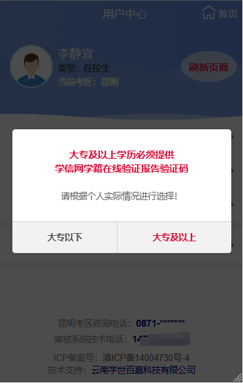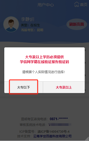 如果注冊的時候選擇了“在校生”系統提示考生選擇“大專以下”或者“大專及以上”