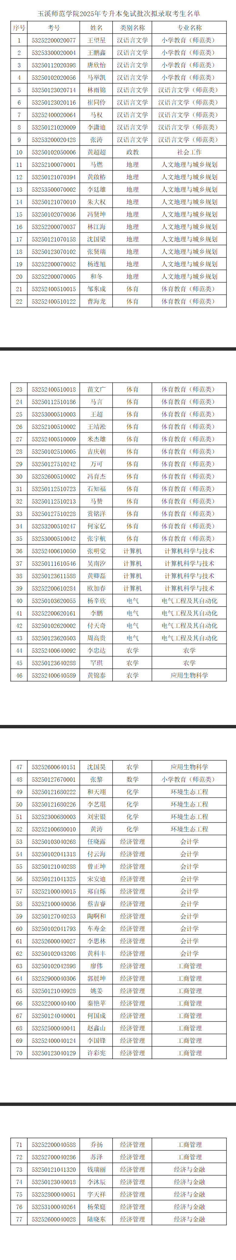 玉溪師范學院2025年專升本免試批次擬錄取考生名單公示