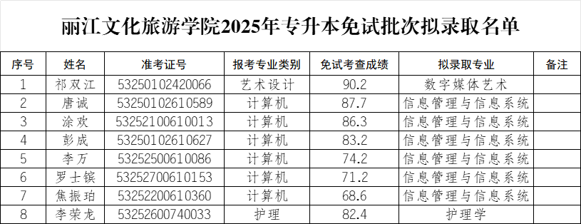 麗江文化旅游學院2025年專升本免試批次預錄取名單 根據《云南省2025年普通高等學校專升本免試招生工作辦法》等文件規定和云南省招生考試院有關工作要求,現將免試批次預錄取名單予以公示。