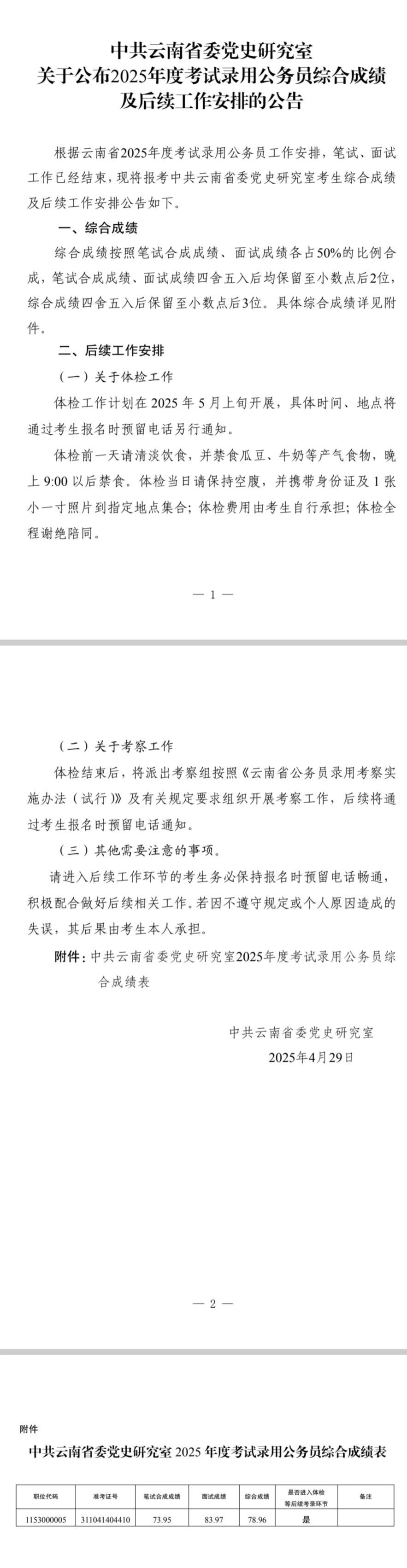 中共云南省委黨史研究室 關于公布2025年度考試錄用公務員綜合成績及后續工作安排的公告