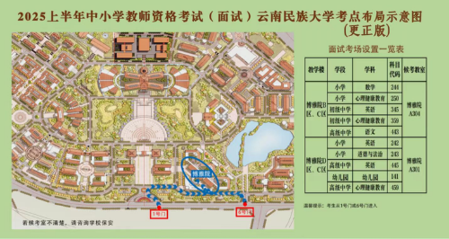 關于2025年上半年中小學教師資格考試(面試) 云南民族大學考點布局示意圖的更正公告 現對《2025年上半年中小學教師資格考試(面試)昆明考區考務事項公告》附件中云南民族大學考點布局示意圖信息更正如下: