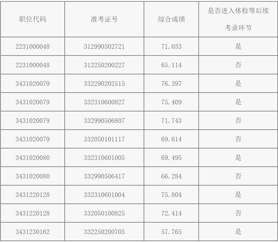 在面試合格分數線以上人員中,按照綜合成績排名和職位招錄人數,等額確定進入體檢和考察的人選。