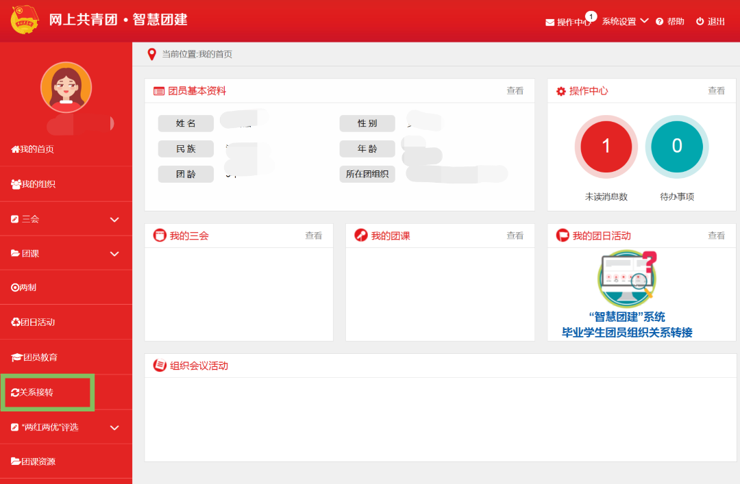 進入“個人中心”后點擊左下角“關系轉接”團員個人發起的情況,可以由團員登錄系統進入個人中心,點擊左側“關系轉接”。在“關系轉接”填好個人信息、轉入組織是否屬于北京、廣東、福建、轉接原因、申請轉入組織信息。