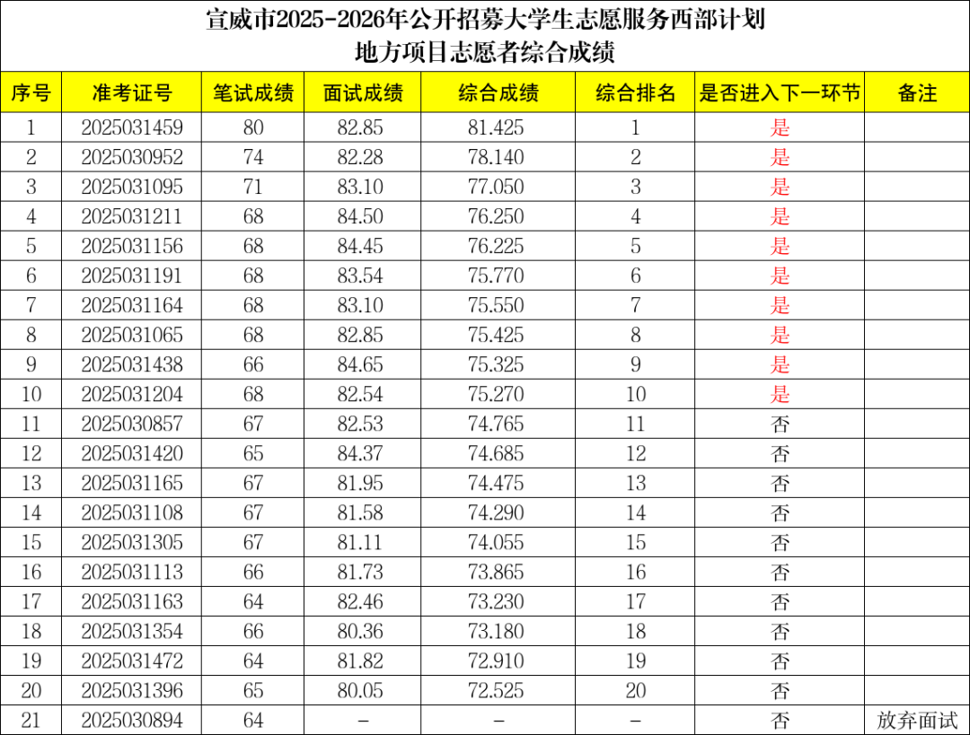 根據《2025-2026年度云南省大學生志愿服務西部計劃實施方案》及《云南省曲靖市關于2025年大學生志愿服務西部計劃地方項目志愿者招募的公告》要求,宣威市項目辦于2025年6月27日組織開展相關面試工作,現將宣威市2025-2026年度大學生志愿服務西部計劃省級地方項目志愿者綜合成績及擬進入體檢人員名單進行公示。