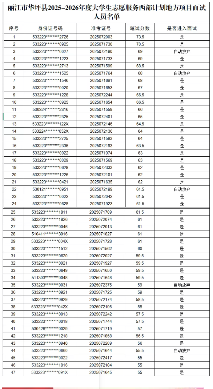 附件:麗江市華坪縣2025--2026年度大學生志愿服務西部計劃地方項目面試人員名單