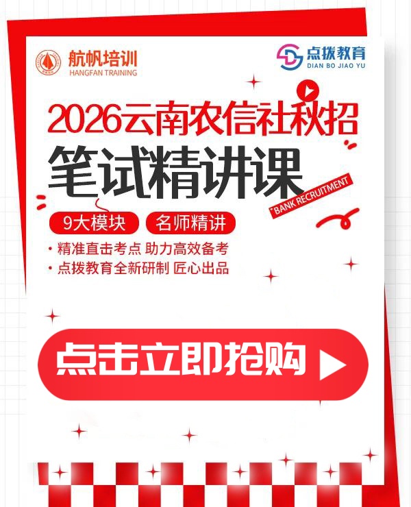 現在,我們十年教研團隊為你帶來制勝法寶——《2026云南農信社筆試10套YA題密卷》和《2026云南農信社秋招筆試精講課》,《2026云南農信社筆試10套YA題密卷》全云南省首發,資深教師出題,把握命題規律,精準考點覆蓋,助你精準高效備考!《2026云南農信社秋招筆試精講課》針對云南省農村信用社校園招聘考試推出的線上網課,以專業化、系統化、高針對性為核心優勢,助力考生高效備考。