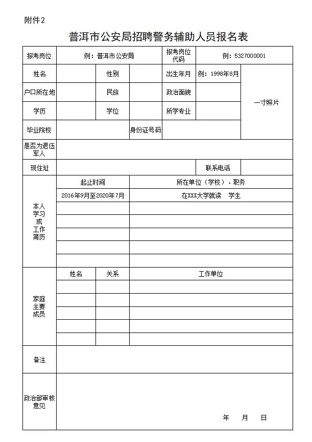 (1)普洱市公安局招聘警務(wù)輔助人員報名表;
