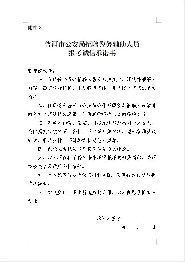 (2)普洱市公安局招聘警務(wù)輔助人員報考誠信承諾書;