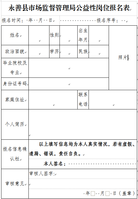 公益性崗位報名表請點擊下載:永善縣市場監(jiān)督管理局公益性崗位報名表.docx