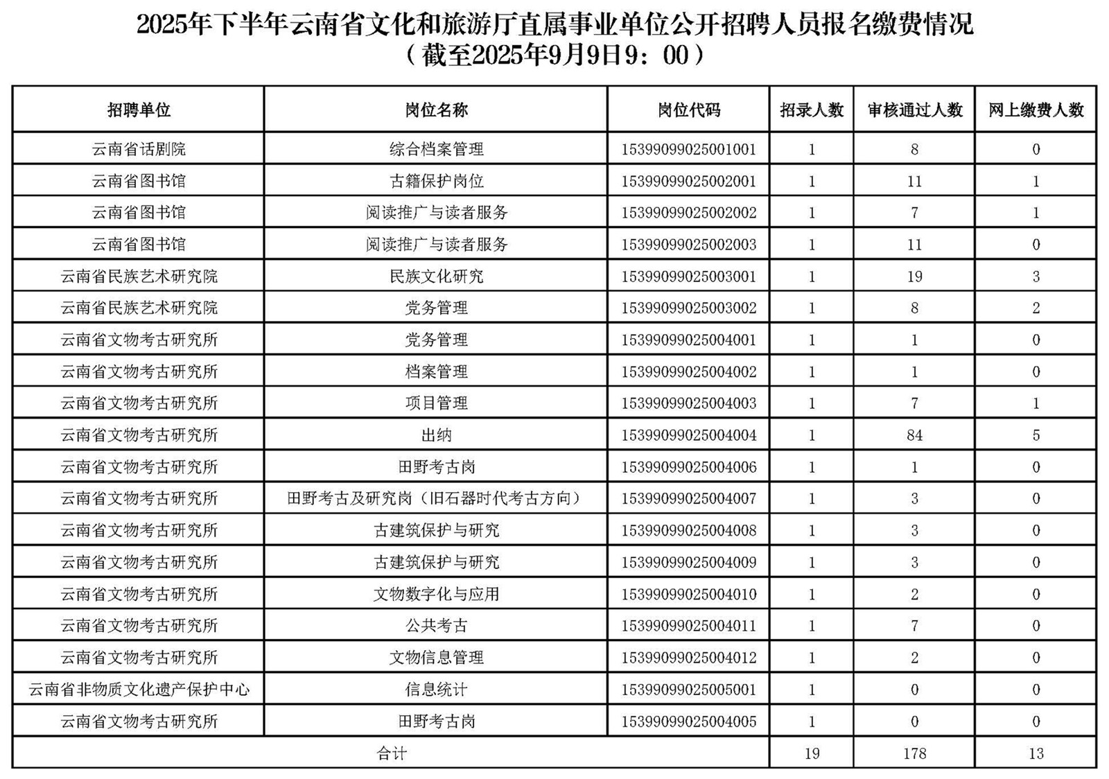 2025年下半年云南省文化和旅游廳直屬事業單位公開招聘人員報名繳費情況 (截至2025年9月9日9:00)