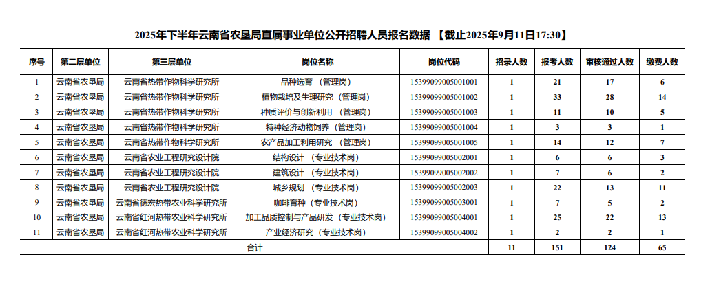 現(xiàn)將2025年下半年云南省農(nóng)墾局直屬事業(yè)單位公開招聘人員報(bào)名數(shù)據(jù)【截止2025年9月11日17:30】公布如下: