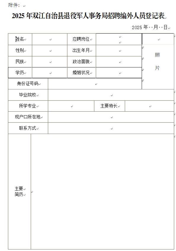 3.報名時需提供本人戶口冊、身份證原件及復印件,近期免冠一寸彩色證件照1張及照片電子版,學歷證書原件及復印件,《2025年雙江自治縣退役軍人事務局招聘編外人員登記表》。填報虛假信息或提供虛假材料的,一經查實,取消報名資格及后續環節,被招聘的取消聘用。