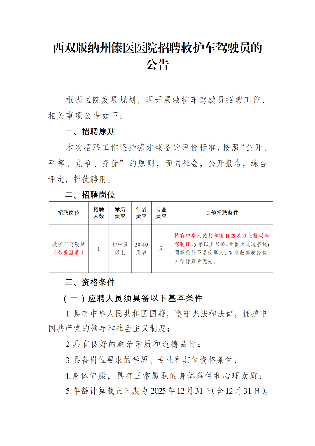 2025年西雙版納州傣醫醫院招聘救護車駕駛員公告