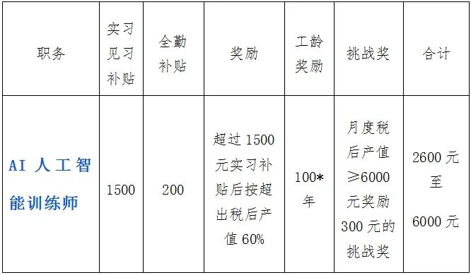綜合薪資: 2600元-6000 元,實習見習補貼1500元+全勤補貼200元+績效獎勵(超過1500元實習補貼后按超出稅后產值的60%計提)+工齡獎勵100元/年+月度挑戰(zhàn)獎300元,轉正后簽訂正式勞動合同,購買社保。